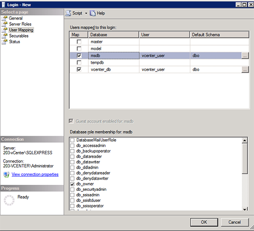 You must do the same thing for both ‘msdb’ and the database your have just created (vcenter_db) 1) Map the database. 2) Select ‘dbo’ as default schema and 3) Select ‘db_owner’. That is for both databases.